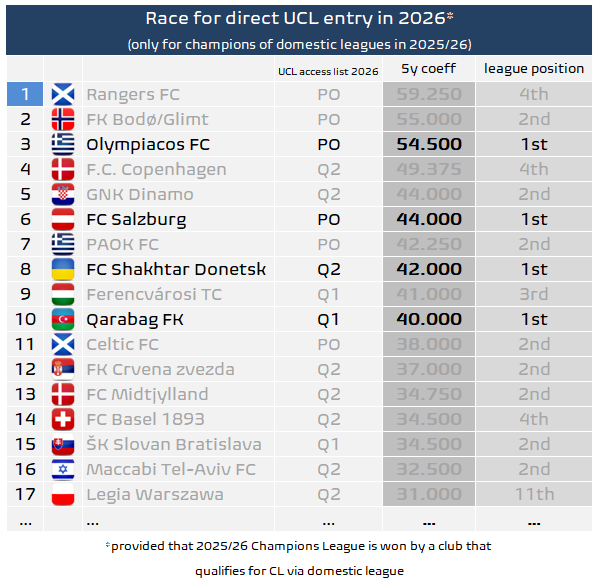 Наразі серед 17 найрейтинговіших клубів, які претендують на пряме потрапляння до основної стадії ЛЧ, лише 4 команди очолюють свої чемпіонати: грецький Олімпіакос, австрійський Зальцбург, донецький Шахтар та азербайджанський Карабах. Ситуація у цих лігах може значною мірою визначити долю додаткового місця.