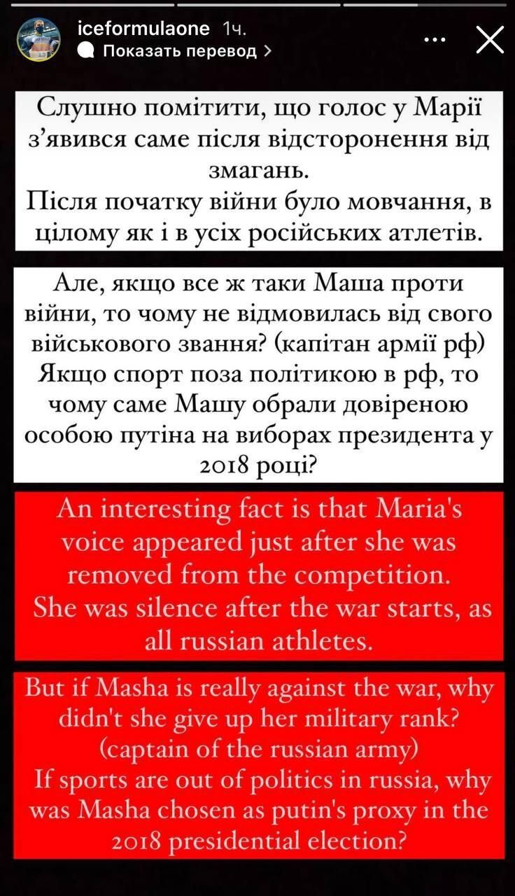 "Правильно заметить, что голос у Марии появился именно после отстранения от соревнований. После начала войны было молчание, в целом, как и у всех российских атлетов.