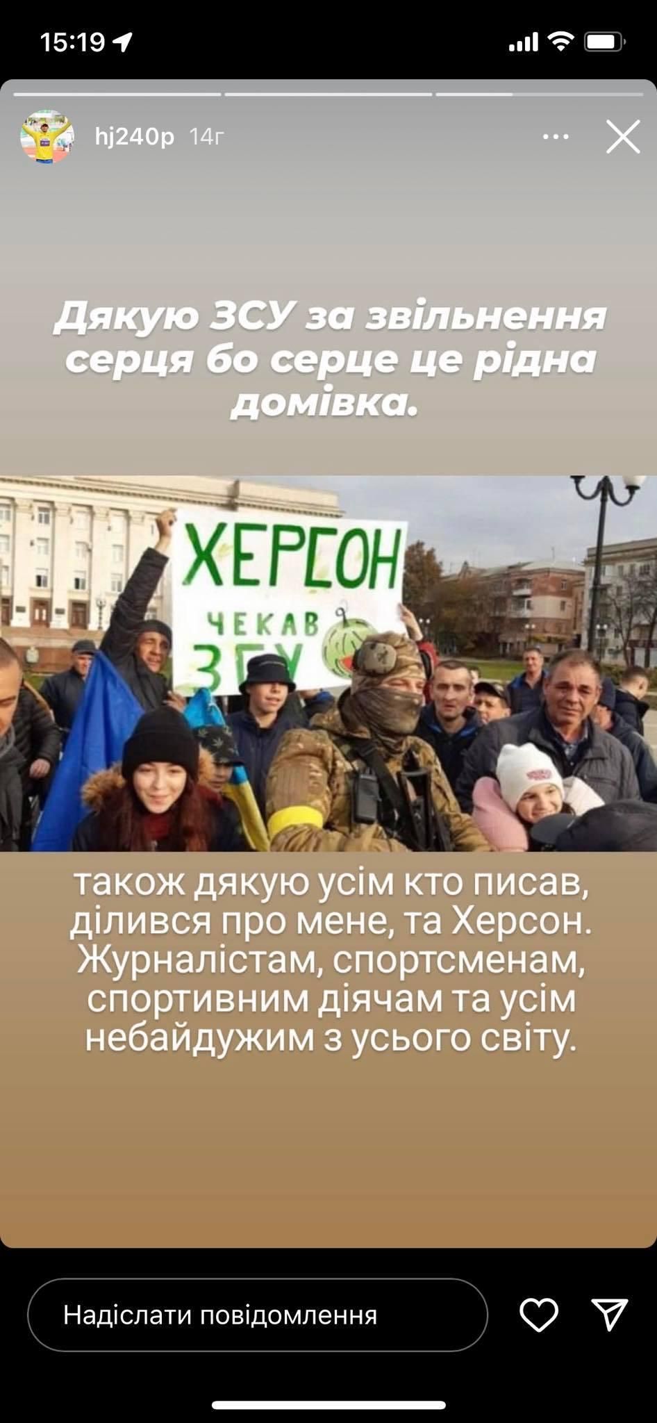 Херсонцы ждали освобождения. Сохраняя украинскую символику, несмотря на все угрозы и издевательства кафиров. Они верили в Украину. Хотел выразить благодарность всем журналистам, спортсменам, спортивным деятелям и неравнодушным со всего мира, кто помогал мне рассказать о войне, охватившей мою родину.