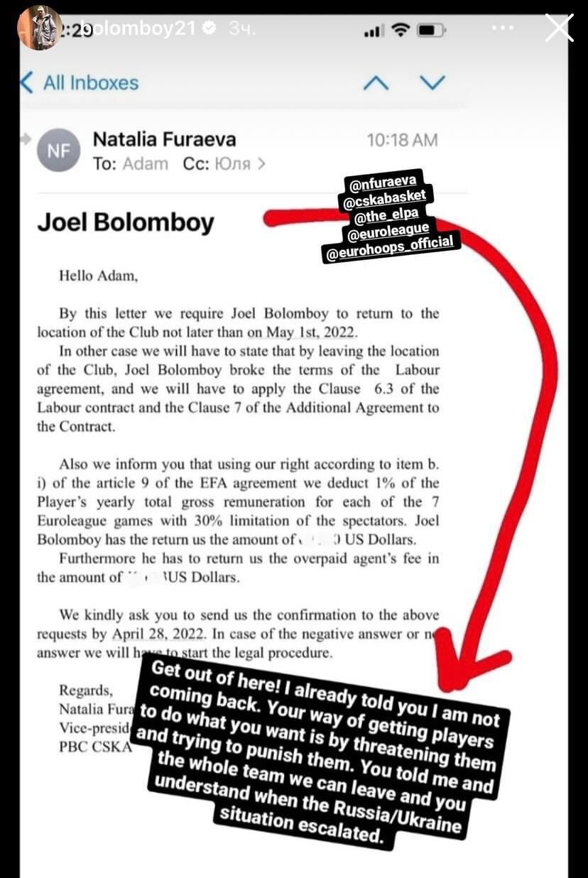 "Отвалите! Я уже сказал вам, что не вернусь. Вы пытаетесь заставить игроков делать то, что вам нужно путем угроз и наказаний. Когда ситуация между Россией и Украиной обострилась, вы сказали мне и всей команде, что все понимаете, и что мы можем поехать", – отреагировал Боломбой в Instagram.
