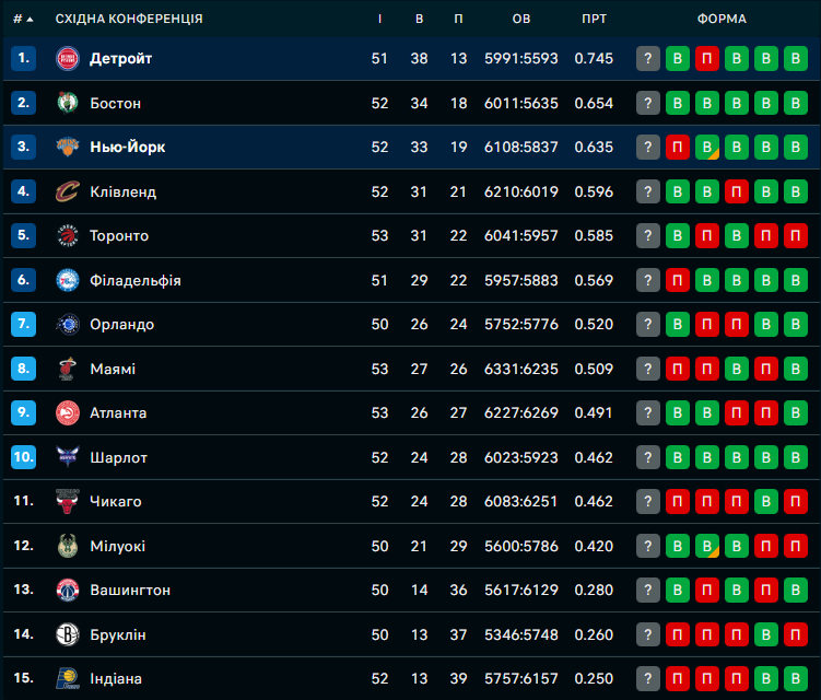 Детройт разгромил Нью-Йорк (118:80). Пистонс продолжают уверенно лидировать в Восточной конференции. На этот раз команда сокрушила Никс, которые идут третьими. Ни один из игроков Детройта не смог набрать хотя бы 20 баллов, но сразу 9 игроков Пистонс набрали как минимум 8 очков. Старались и игроки, которые выходили со скамейки запасных.