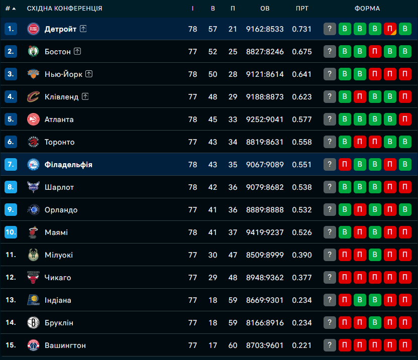 Детройт одолел Филадельфию (116:93). Несмотря на отсутствие лидера Кейда Каннингема "поршни" с легкостью одолели Филадельфию. Для Детройта эта победа стала 57-й в регулярном сезоне, поэтому это досрочно обеспечило команде первое место на Востоке. Теоретически команду еще может догнать Бостон, у которого хуже показатели, поэтому Селтикс точно будут вторыми.