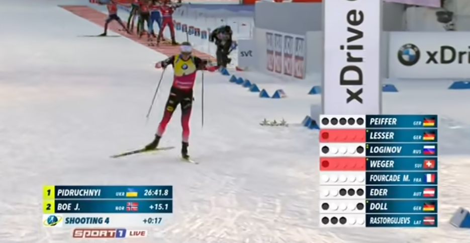 На позначці 6,3 кілометра Підручний відставав від норвежця на понад хвилину. Відіграти такий проміжок у праймового Йоханнеса – звучить як фантастика. Втім на третьому вогневому рубежі норвежець вдруге не закрив одну мішень. Натомість Підручний знову шокував надзвичайно швидким нулем й блискавично вирвався на другу позицію. Хто б міг уявити!