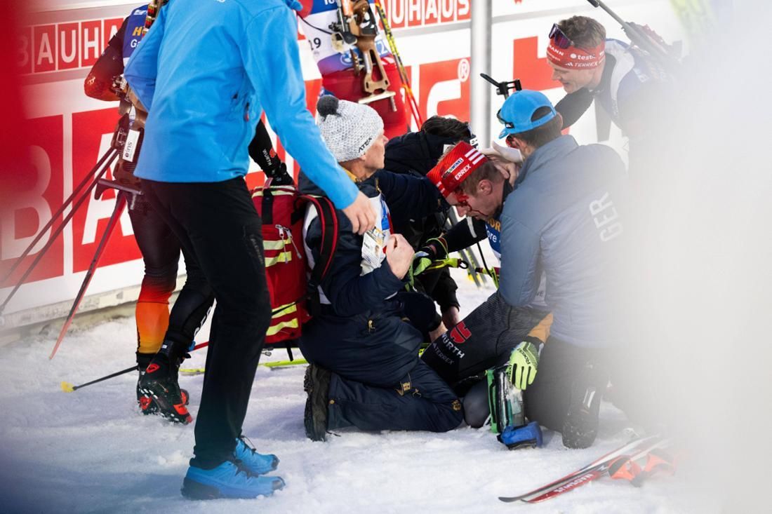 Беда постигла 32-летнего спортсмена в конце гонки. Он не удержался на лыжах во время последнего спуска и потерпел болезненное падение, во время которого винтовка рассекла ему голову.