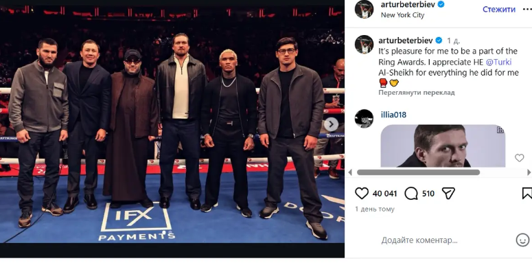 Усик пока никак не комментировал фото. Стоит напомнить, что Бетербиев поддерживает Рамзана Кадырова и попал в список российских спортсменов, которые поддерживают войну против Украины.