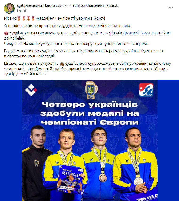 "Имеем 4 бронзовые награды на чемпионате Европы по боксу. Конечно, если бы не предвзятость судей, сорт медалей был бы другим. Судьи приложили максимум усилий, чтобы не выпустить в финалы Дмитрия Замотаева и Юрия Захареева. Почему так? По-моему, потому, что этот турнир спонсирует контора Газпром.