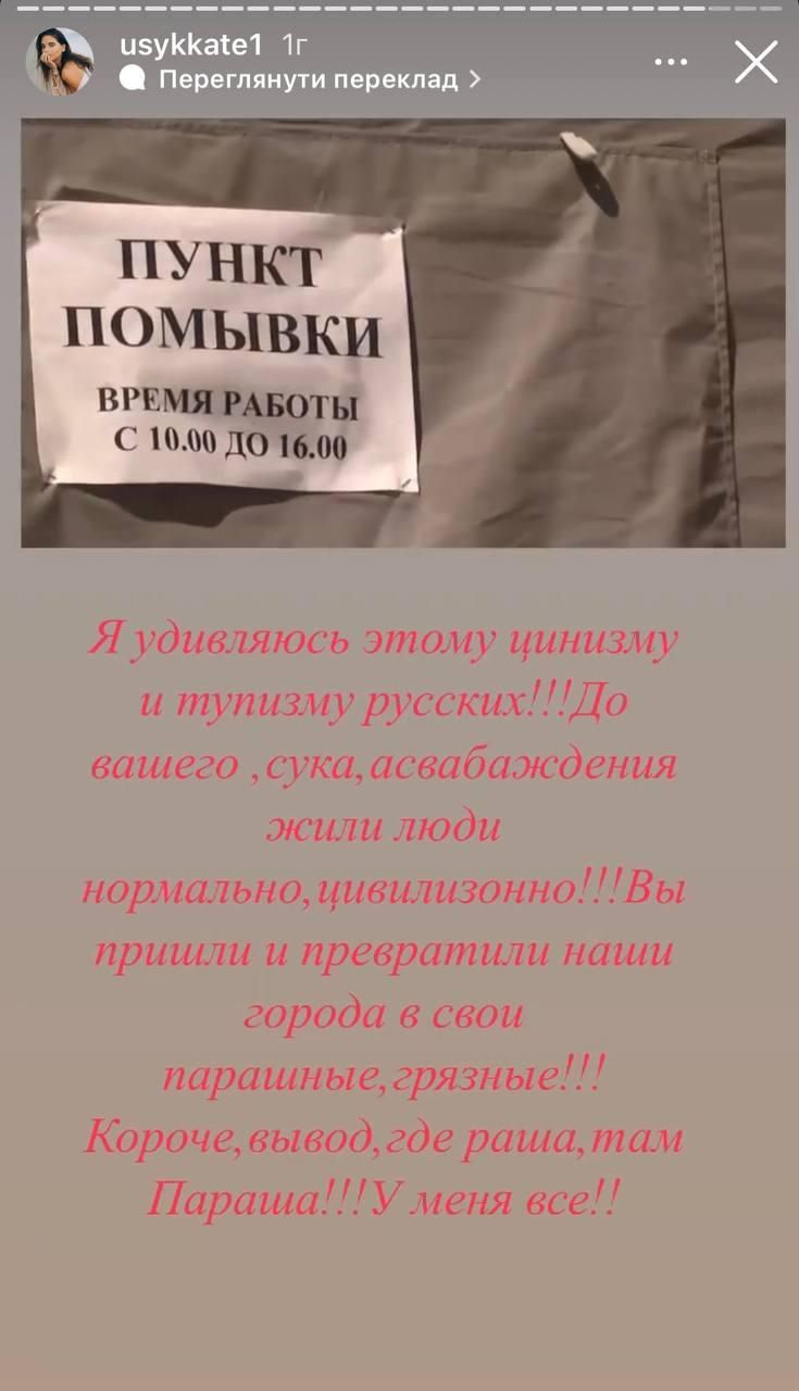 "Я удивляюсь этому цинизму и тупизму россиян!!! К вашему, су*а, освобождению люди жили нормально, цивилизованно! Вы пришли и превратили наши города в свои парашные и грязные. Вывод: где раша – там параша. У меня все", – написала Екатерина на своей странице в Instagram.