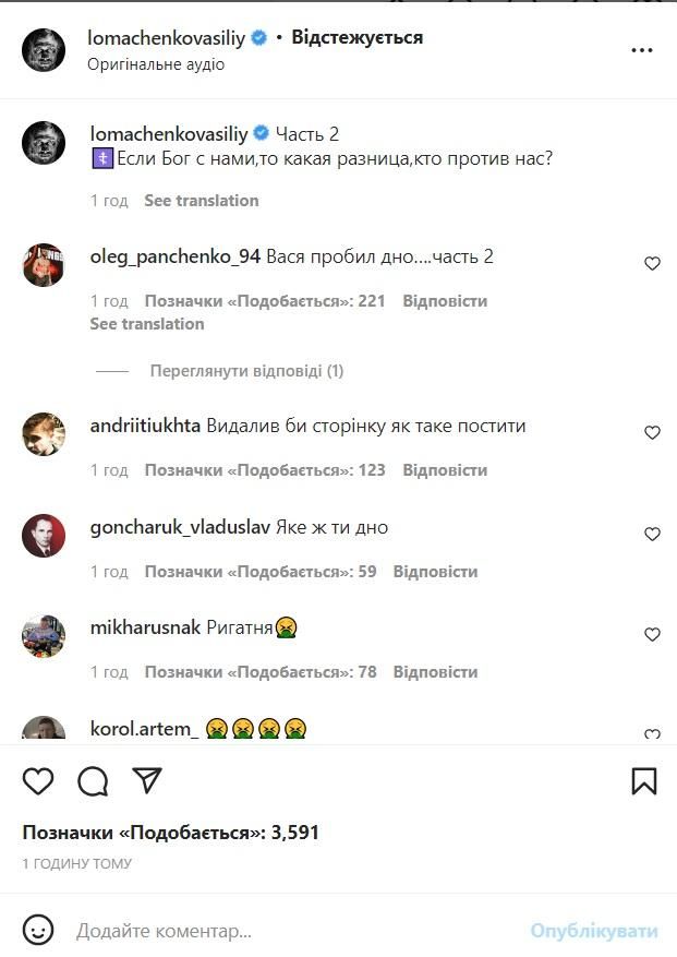 В комментариях подписчики преимущественно отрицательно восприняли публикацию боксера. "Вася пробил дно – часть 2", – отозвался на видео известный украинский боец ММА Олег Панченко.