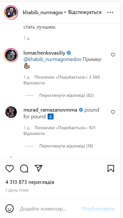 Василий Ломаченко оставил под постом Хабиба Нурмагомедова краткий комментарий: "Пример". Звезда украинского бокса и россиянин уже не впервые комментируют посты друг друга в соцсетях. Ранее Хабиб неоднократно желал Василию удачи накануне его поединков.