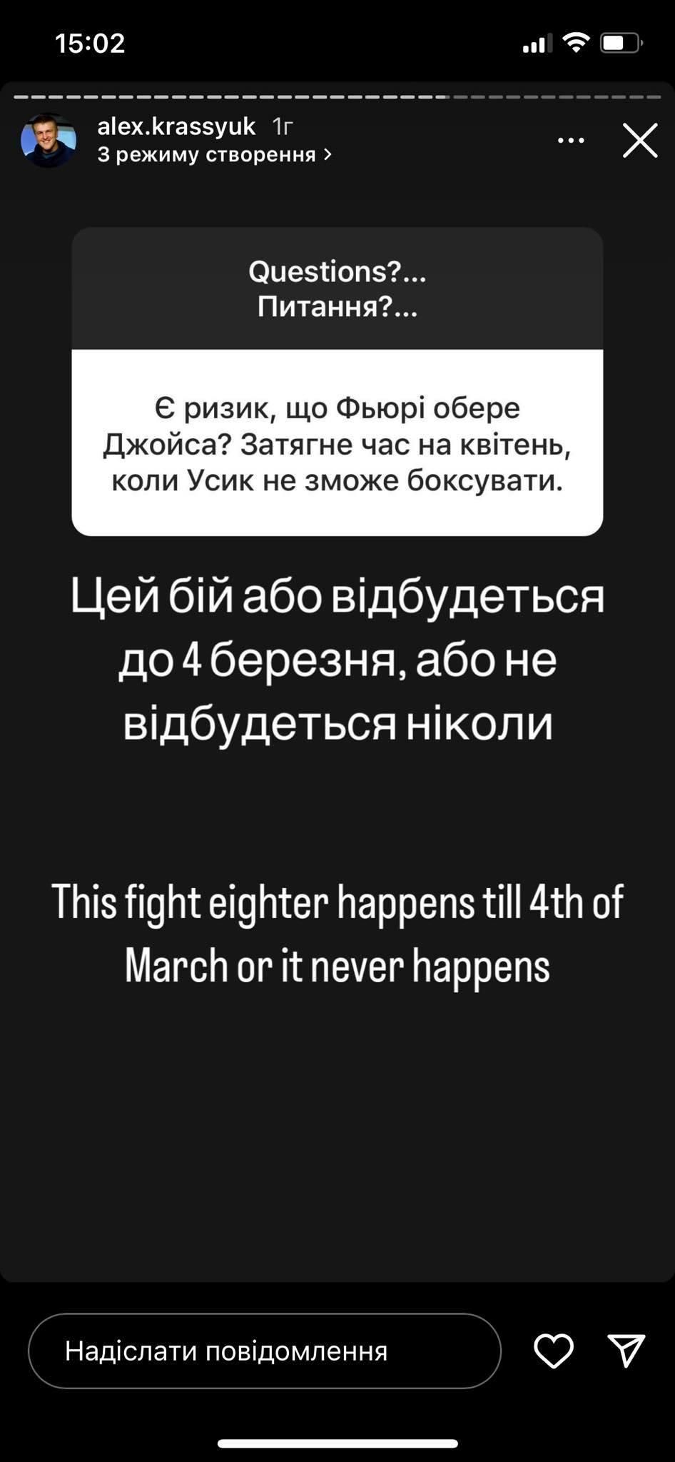 "Этот бой либо состоится до 4 марта, либо не состоится никогда", – написал Красюк в Instagram.