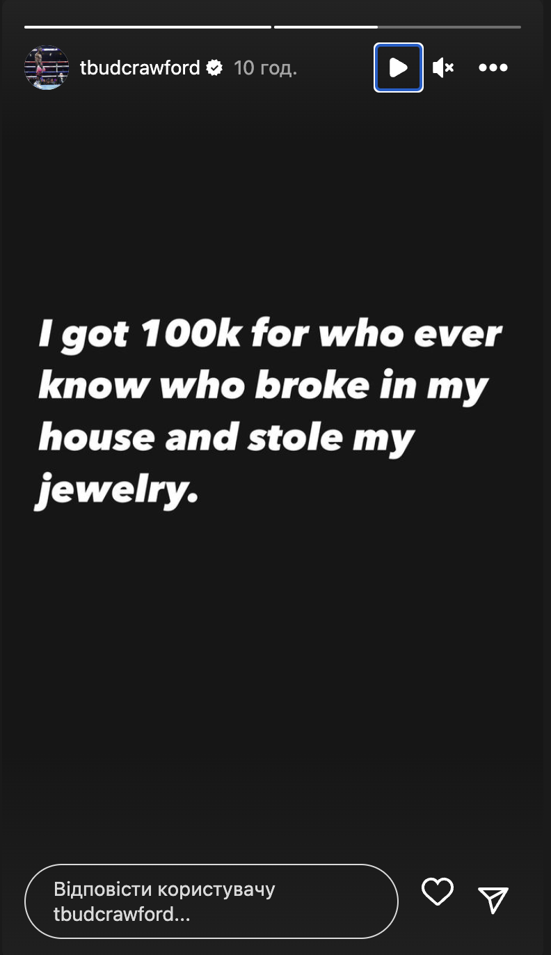 О неприятном инциденте боксер сообщил на своей странице в Instagram. Кроуфорд не стал рассказывать о подробностях, но назначил вознаграждение за информацию о ворах.