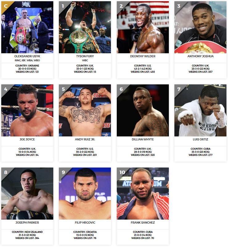 Обладатель большинства титулов в королевском дивизионе Александр Усик оказался сразу на двух вершинах. Во-первых, украинский чемпион получил отдельное место в списке лучших боксеров мира в своем весе, поскольку владеет титулом The Ring от вышеупомянутого издания. Во-вторых, он продолжает возглавлять десятку лучших боксеров мира вне весовой категории PoundForPound.