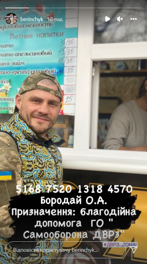 На своей странице в Instagram Денис Беринчик поделился фото в военной форме с призывом помочь самообороне ДВРЗ (жилой массив Киева). Уроженец Луганщины также показал, как нужно чистить автомат.
