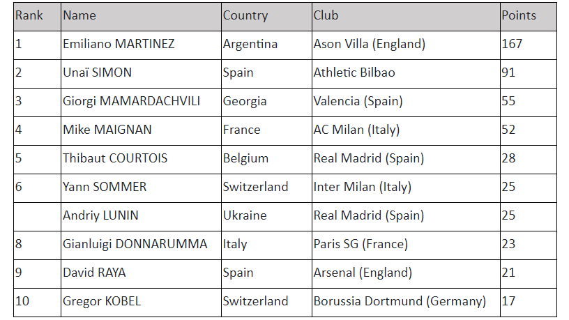 Второе место занял испанец Унаи Симон, выступающий за Атлетик Бильбао, третьим стал вратарь сборной Грузии и Валенсии Гиорги Мамардашвили. Примечательно, что одноклубник Лунина Тибо Куртуа расположился пятым с 28 очками.