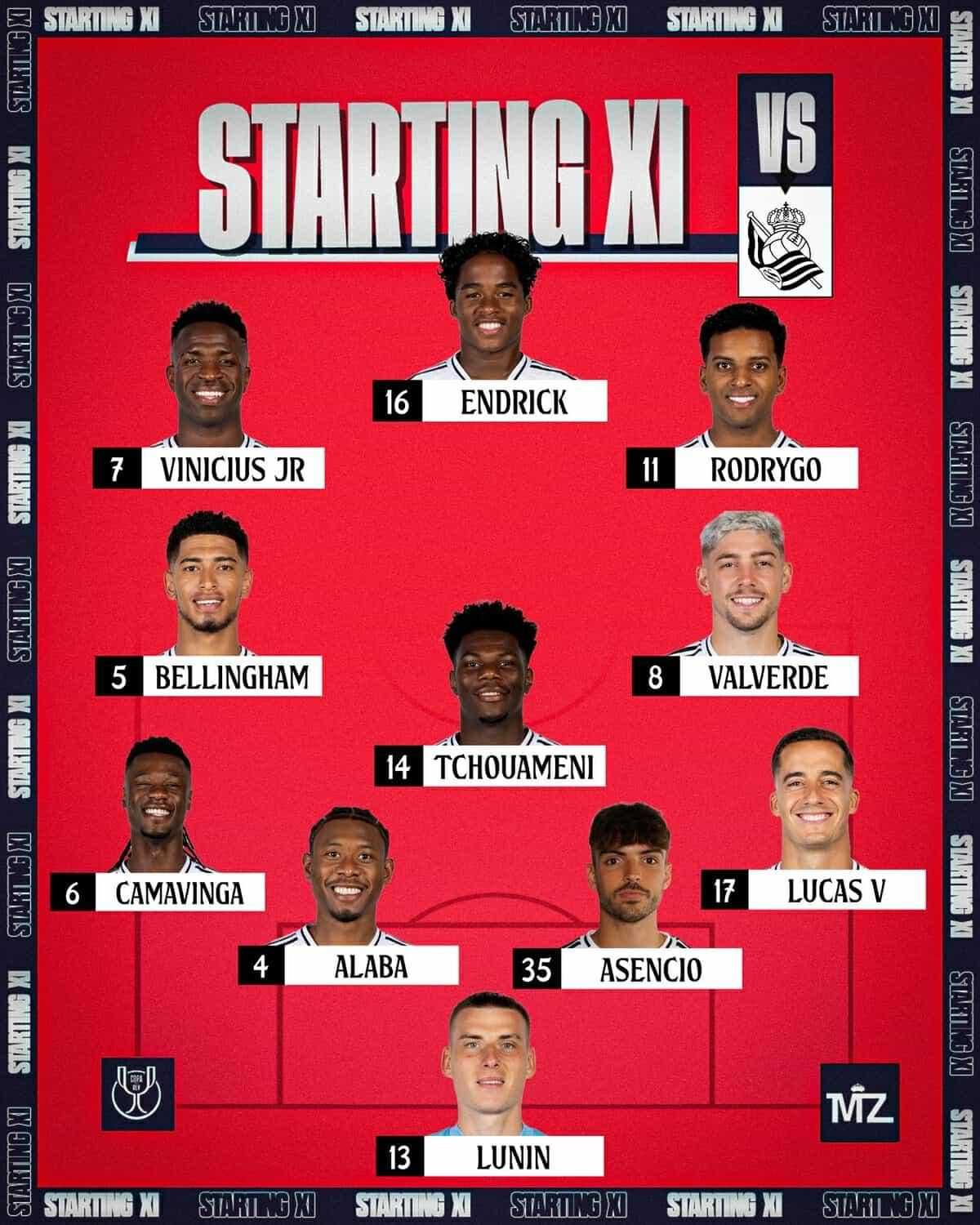 Стартовый состав Реала: Лунин – Камавинга, Алаба, Ассенсио, Лукас Васкес – Беллингем, Чуамэни, Вальверде – Винисиус Жуниор, Родриго, Эндрик