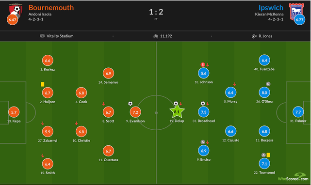 В матче 30-го тура АПЛ Борнмут дома уступил Ипсвичу со счетом 1:2.