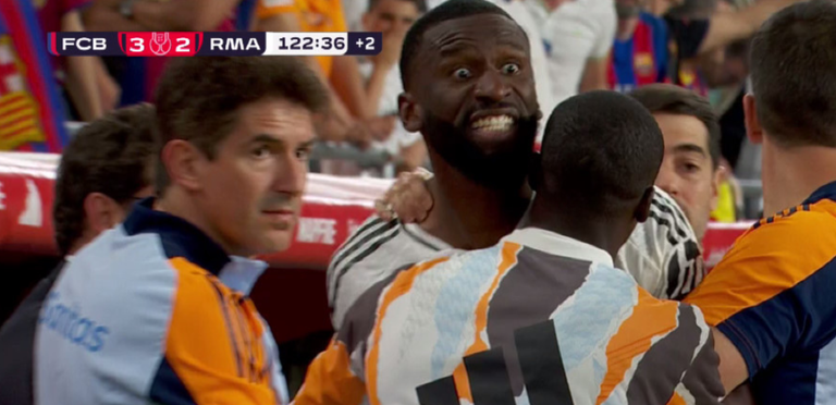 На последних минутах финала Кубка Испании, в котором Барселона обыграла Реал со счетом 3:2, Рюдигер получил красную карточку за безумное поведение.