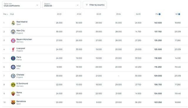 После финала Лиги чемпионов между ПСЖ и Интером УЕФА внес коррективы в клубный рейтинг европейских команд.