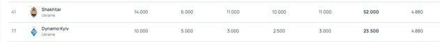 Что касается украинских клубов, то лучшая позиция остается у донецкого Шахтера. "Горняки" сейчас занимают 41-ю позицию. Киевское Динамо на 77-м месте. Другие украинские команды не попали в топ-100.