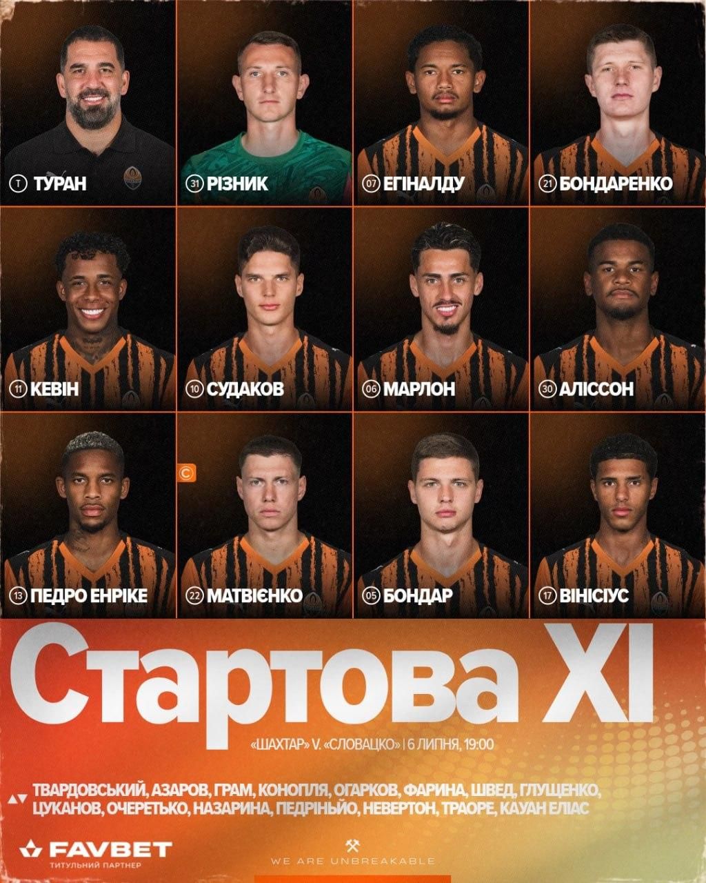 Стартовый состав Шахтера: Резник, Эгиналду, Бондаренко, Кевин, Судаков, Марлон, Алиссон, Педро Энрике, Матвиенко, Бондарь, Винисиус