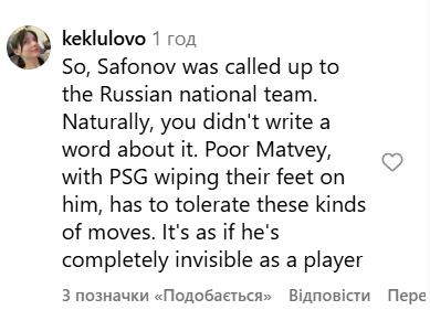 В своих соцсетях парижане отметили каждого игрока, который будет выступать за свою сборную, а вот о Сафонове "случайно" забыли. Зато об Илье Забарном, которого ожидает противостояние с Францией, вспомнили и пожелали украинцу успеха.