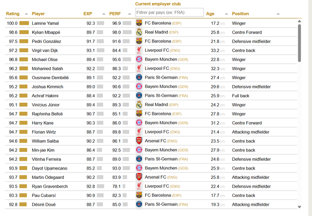 Один из лидеров Барселоны Ламин Ямаль возглавил список с рейтингом 100. 18-летний вингер сборной Испании опередил Килиана Мбаппе (результат в 98,6 балла) и другого футболиста каталонцев Педри (97,5), который замкнул топ-3 лидеров. Защитник Вирджил ван Дейк (Ливерпуль) занял четвертую строчку.