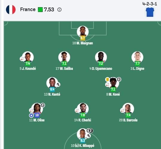 В составе "Ле Бле" самый высокий показатель имеет Майкл Олисе – 10 баллов! На втором месте Килиан Мбаппе – 8,3.