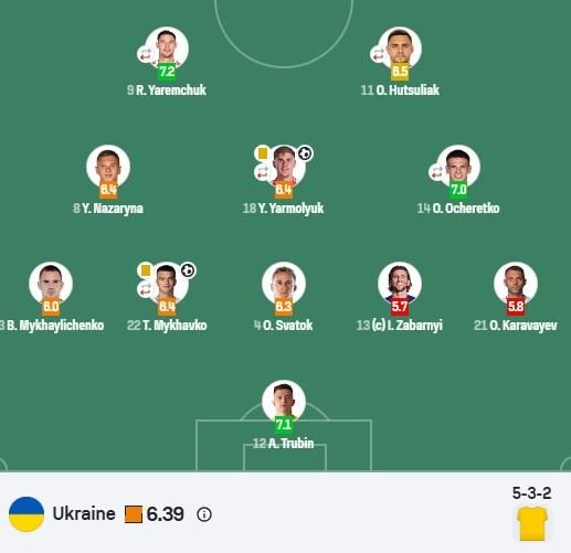 Самую высокую оценку в составе сборной Украины от статистического портала Sofa Score получил Роман Яремчук – 7,2 балла. На втором месте Анатолий Трубин, у которого 7,1. А вот самый низкий балл у Ильи Забарного – 5,7. Лишь немного выше показатель у Александра Караваева – 5,8.