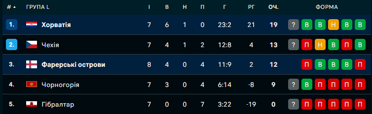 Перед последним туром Хорватия (19 очков) опережает Чехию (13 баллов). В другом матче группы L Черногория дожала Гибралтар (2:1). Обе команды потеряли шанс на ЧМ, поэтому матч не имел турнирного значения.