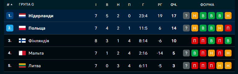 Польша и Нидерланды победителя не выявили (1:1). На гол Камински перед перерывом, Нидерланды ответили точным выстрелом Депая. Благодаря этому результату "оранжевые" фактически обеспечили себе путевку в США, Канаду и Мексику. Перед последним туром команда опережает Польшу на 3 очка. Полякам нужно побеждать с экстремальным счетом, чтобы обойти Нидерланды (они должны проиграть Литве – прим.) по дополнительным показателям.
