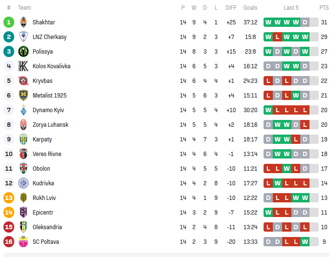 После 14 матчей Динамо продолжает занимать позорное седьмое место. Это еще один антирекорд – ни разу в истории киевляне не были так низко в турнирной таблице после 10+ туров. В активе столичного клуба 20 зачетных баллов (5 побед, 5 ничьих и 4 поражения). Отставание от первой строчки составляет аж 11 очков, а в зону еврокубков 7 пунктов.