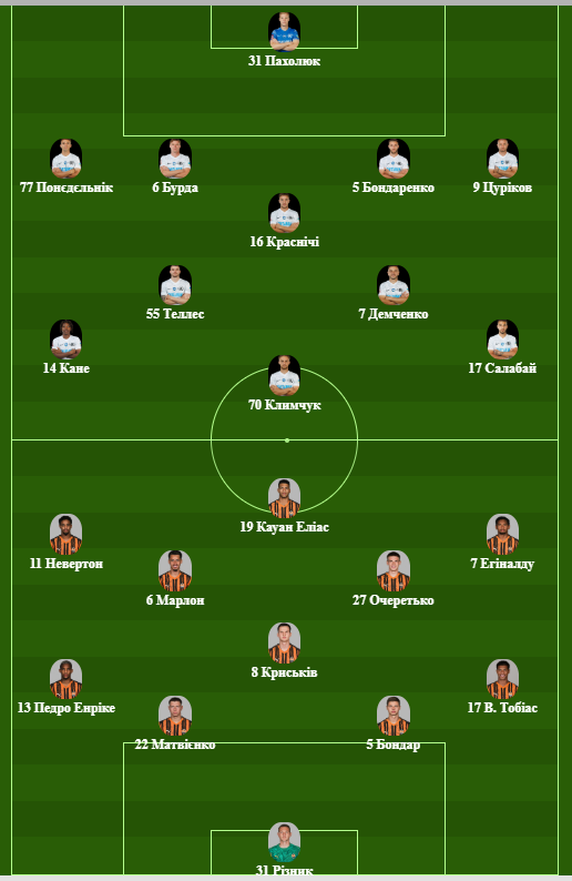 Стартовый состав Шахтера: Резник – Педро Энрике, Матвиенко, Бондарь, Винисиус Тобиас – Марлон, Очеретько, Криськив – Невертон, Кауан Элиас, Эгиналду.
