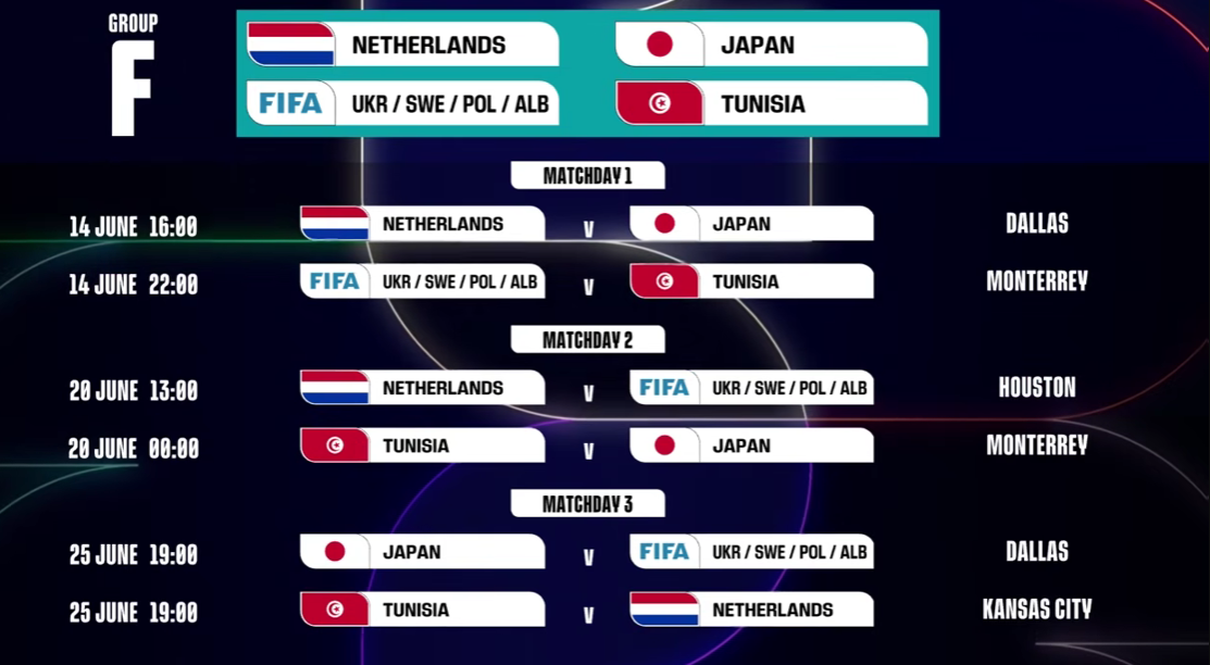 Сборная Украины в случае квалификации к ЧМ-2026 попадет в группу F, где также сыграют Нидерланды, Япония и Тунис. Организаторы турнира уже определились с датой и местом проведения всех поединков группового этапа.