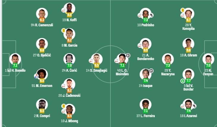 В течение поединка центрбек выиграл 3 из 4 верховых дуэли, выполнил 9 перехватов и 3 возврата мяча. Исаке имеет оценку 7,4 балла. У Мейреллиша – 7,1. Ниже всех статистический портал оценил игру защитника донетчан Ефима Конопли – 6,7.