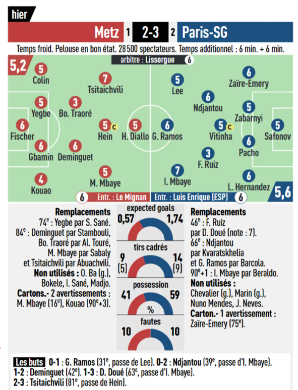 Украинец Илья Забарный появился на поле в матче с Метцом с первых минут. Специалисты Le Parisien и L'equipe оценили его выступление лишь в 5 баллов. Такую же низкую оценку получил и португальский хавбек парижан Витинья.