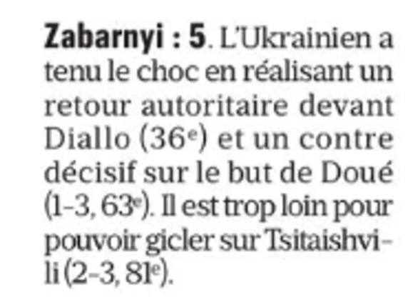 "Забарный, оценка – 5. Украинец смог выдержать удар, когда сделал уверенный отбор перед Диалло на 36-й минуте и повторил это снова перед ключевым голом Дуэ во втором тайме. Но Забарный был слишком далеко, чтобы остановить Цитаишвили, который прорвал защиту парижан на 81-й минуте)", – сообщает Le Parisien.