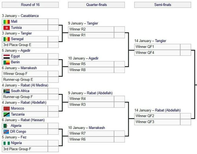 Перед завершением группового этапа уже известны четыре пары 1/8 финала: Мали – Тунис, Египет – Бенин, Марокко – Танзания, Алжир – ДР Конго.