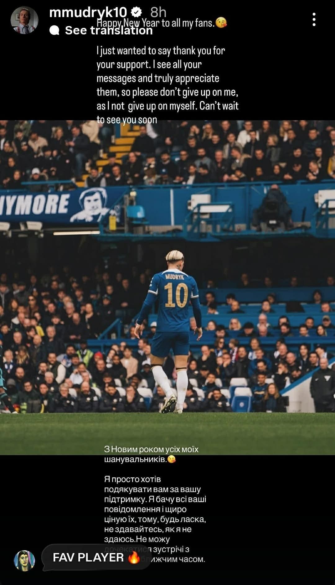 Однако в новогоднюю ночь Мудрик обратился в Instagram к подписчикам. "С новым годом всех моих поклонников. Я просто хотел поблагодарить за вашу поддержку. Я вижу все ваши сообщения и искренне ценю их. Поэтому, пожалуйста, не сдавайтесь, как я не сдаюсь. Не может дождаться встречи с вами в ближайшее время", – написал Михаил в stories.