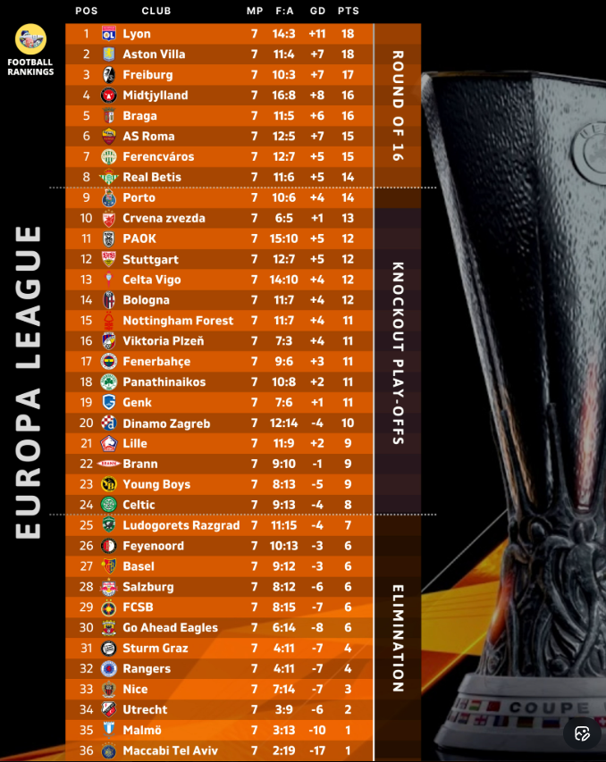 Рома после семи туров идет на 6 позиции и гарантированно сохранит место в 1/8 финала, если не проиграет Панатинаикосу в последнем матче.
