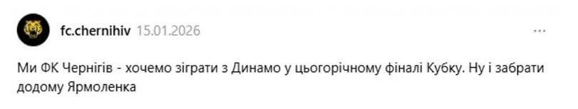 "Мы, ФК Чернигов – хотим сыграть с Динамо в финале Кубка Украины в этом году. Ну и забрать домой Ярмоленко", – говорится в сообщении.