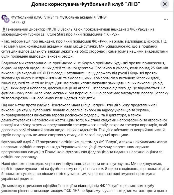Футбольный клуб ЛНЗ обратился с официальным письмом в ФК Ракув, а также в ближайшее время направит официальное обращение к Украинской ассоциации футбола с просьбой способствовать урегулированию ситуации с Польской футбольной федерацией и предоставления надлежащей оценки и официального рассмотрения", – говорится в сообщении.