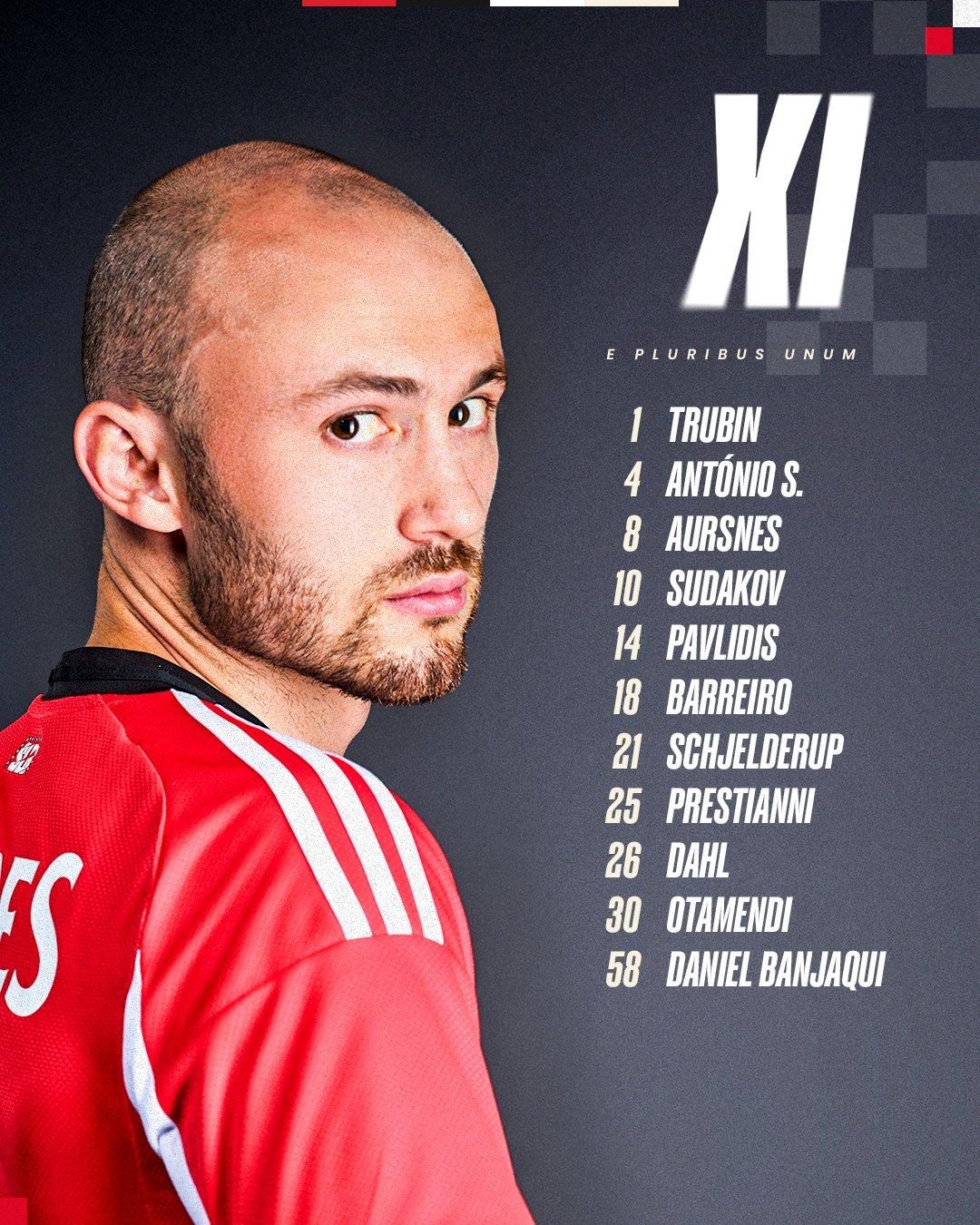 Стартовый состав Бенфики: Трубин – Даль, Отаменди, Силва, Банжакуи – Баррейро, Аурснерс, Судаков, Шельдеруп, Престиано – Павлидис
