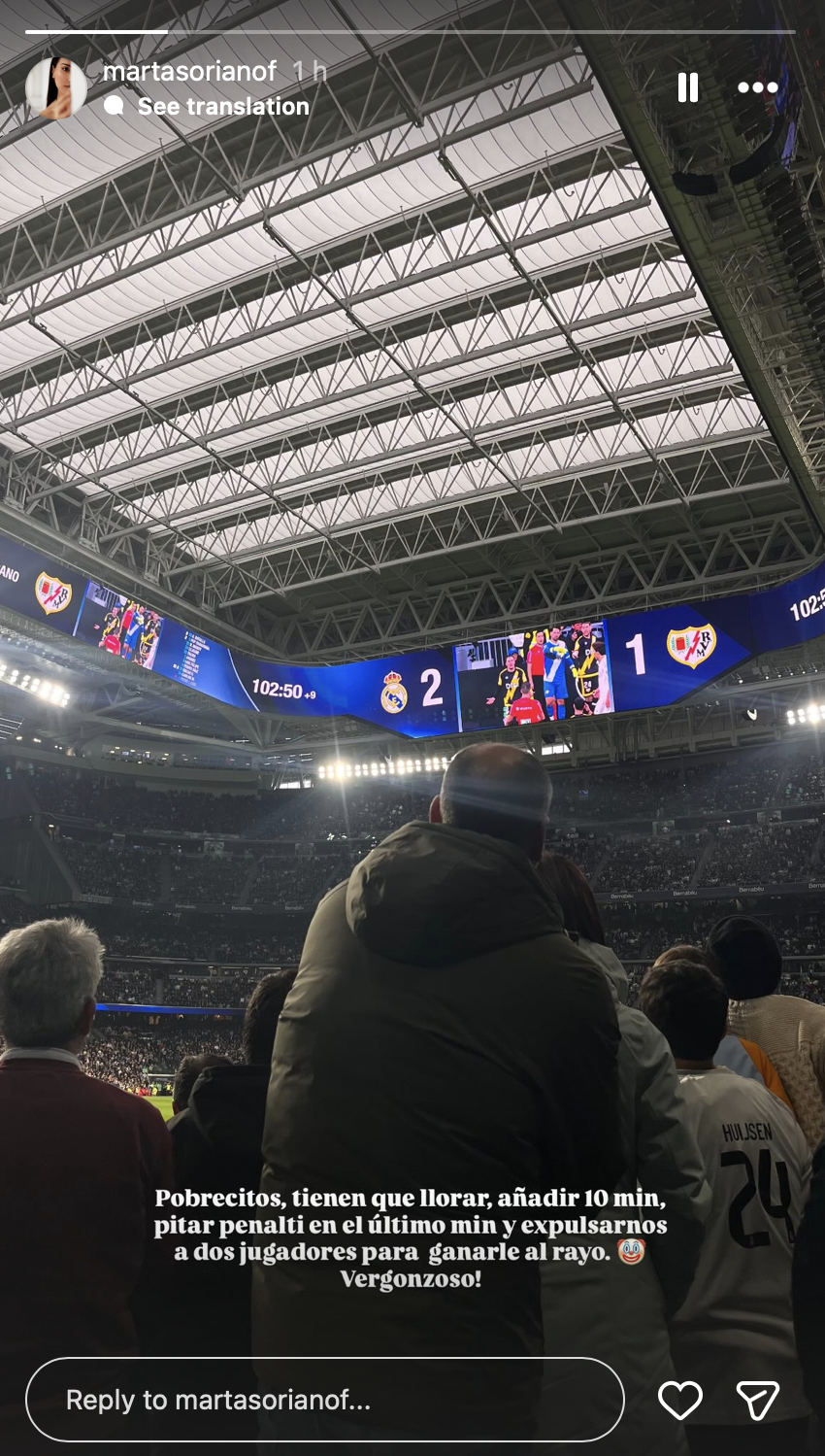 "Бедняги, им приходится плакать, добавлять 10 минут, назначать пенальти в последней минуте и удалять двух наших игроков, чтобы победить Райо. Позорное зрелище!" – написала Марта Сориано в Instagram Stories.