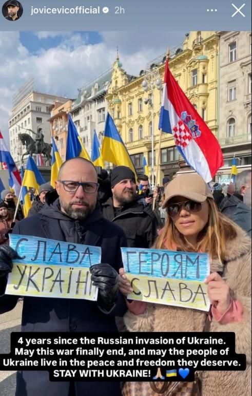 Хорватский специалист вместе со своей супругой также принял участие в акции. На своей странице в Instagram Йовичевич поделился с подписчиками сторис с подписью: "Четыре года со времени вторжения России в Украину. Пусть эта война наконец закончится, и пусть народ Украины живет в мире и свободе, которых он заслуживает. Оставайтесь с Украиной!"
