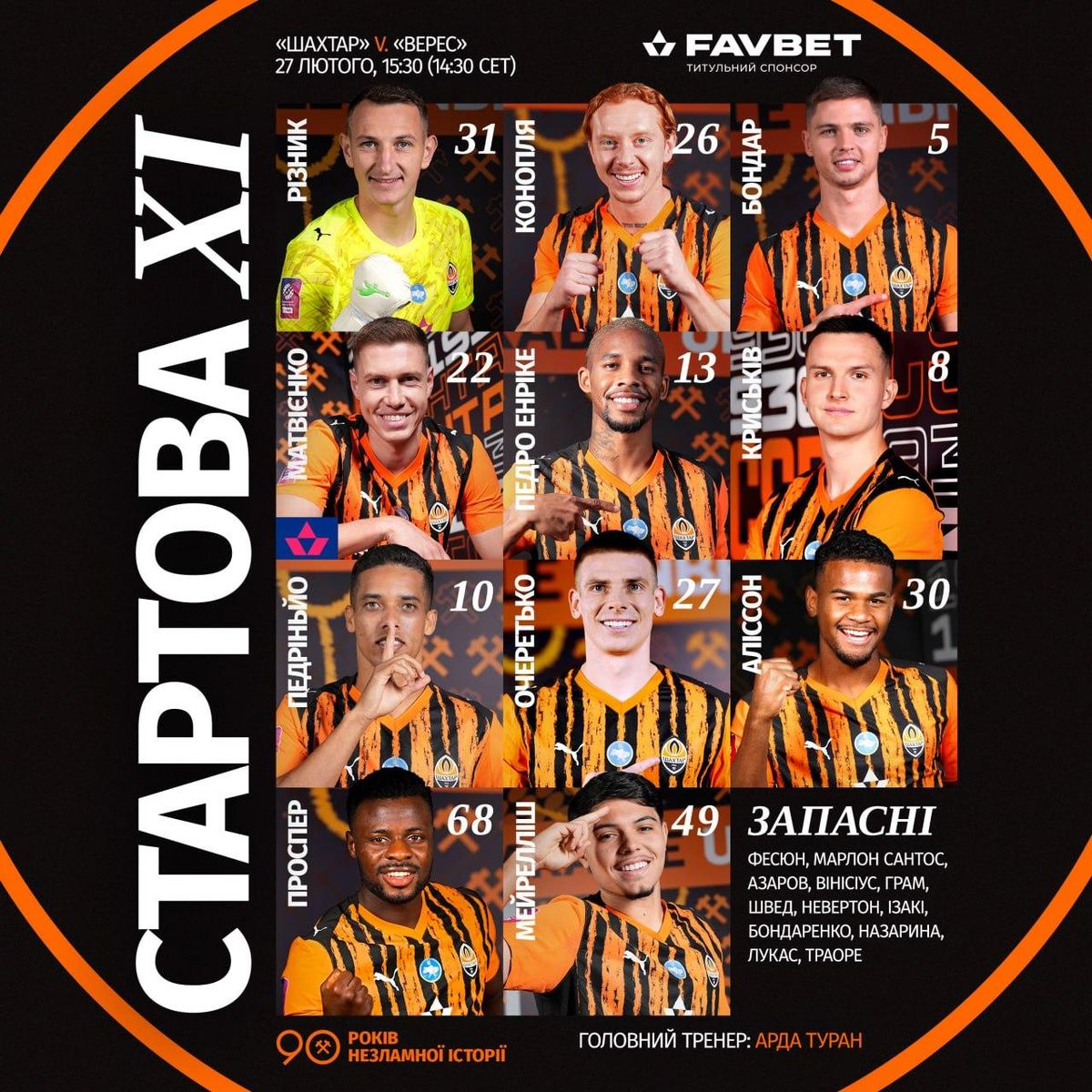 Шахтер: Резник – Конопля, Бондарь, Матвиенко, Педро Энрике – Педриньо, Очеретько, Крыськив – Аллисон, Траоре, Мейреллиш.
