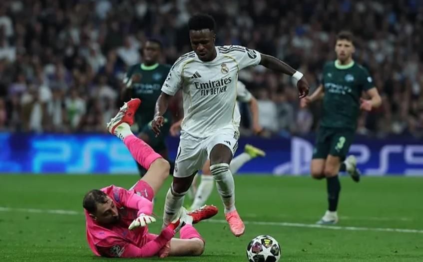 Ман Сити задрал линию экстремально высоко, поэтому Винисиус со своей половины вывалился на свидание с Доннаруммой. Джиджи сегодня очень нервный – задергался, поздно бросился в ноги сопернику и привез пенальти. Впрочем, сам исправился. Кипер "горожан" потащил хилый удар бразильца с точки.