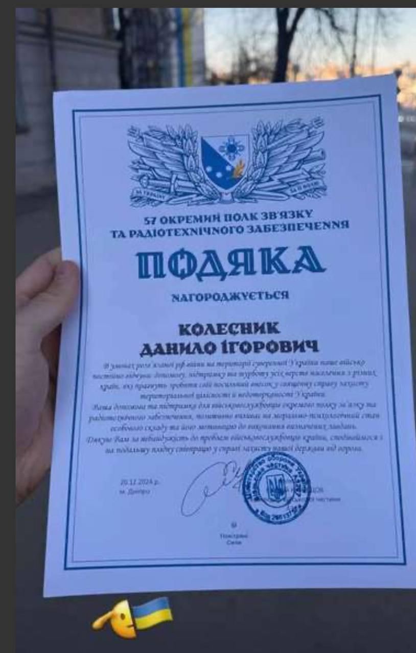 Бывший форвард ковалевского Колоса-2 Даниил Колесник, который оказался в центре скандала из-за нападения на представителя ТЦК, попытался оправдать свою репутацию. Футболист обнародовал в социальных сетях официальную благодарность от Вооруженных сил Украины, датированную декабрем 2024 года.