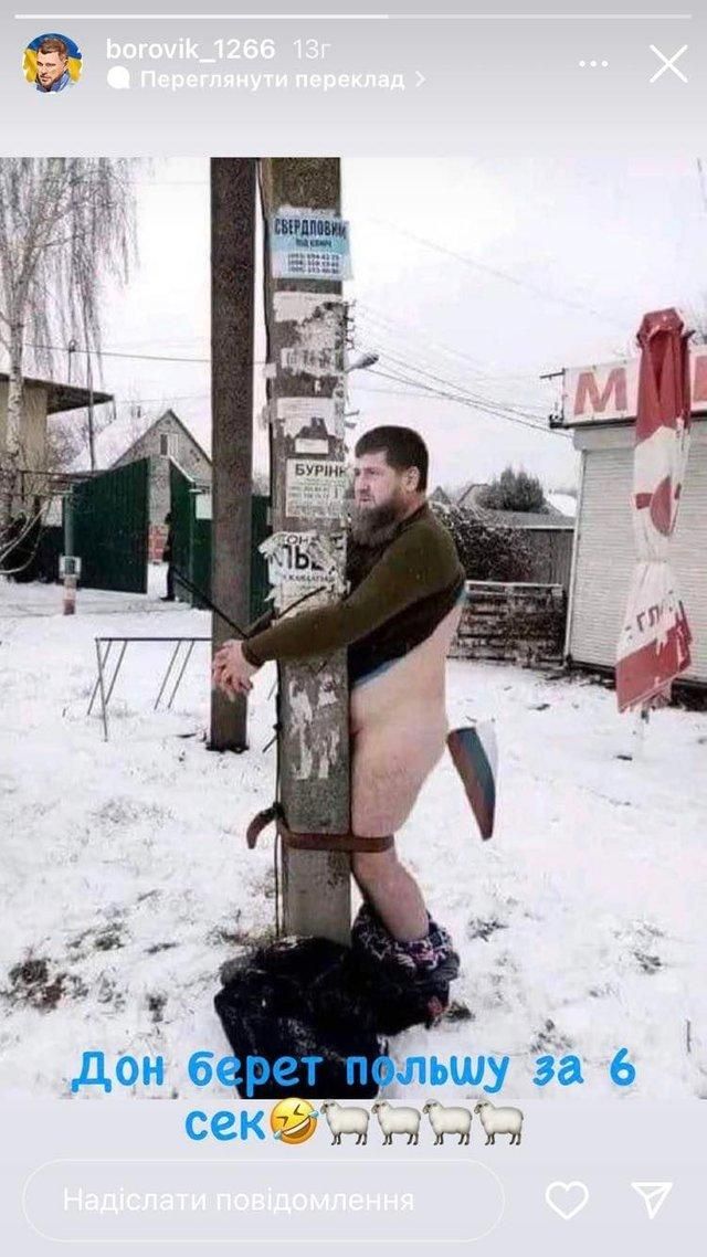 Боровик выложил фотожабу, на которой кадырова изобразили нагим и привязали к столбу. "Дон берет Польшу за 6 секунд", – подписал картинку 37-летний экс-голкипер, который должен в своем активе забить гол в элитном дивизионе украинского футбола.