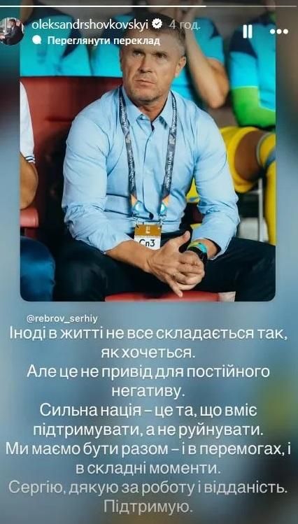 "Иногда в жизни не все складывается так, как хочется. Но это не повод для постоянного негатива. Сильная нация – это та, что умеет поддерживать, а не разрушать. Мы должны быть вместе – и в победах, и в сложные моменты. Сергею, спасибо за работу и преданность. Поддерживаю", – написал Шовковский в Instagram-сторис.