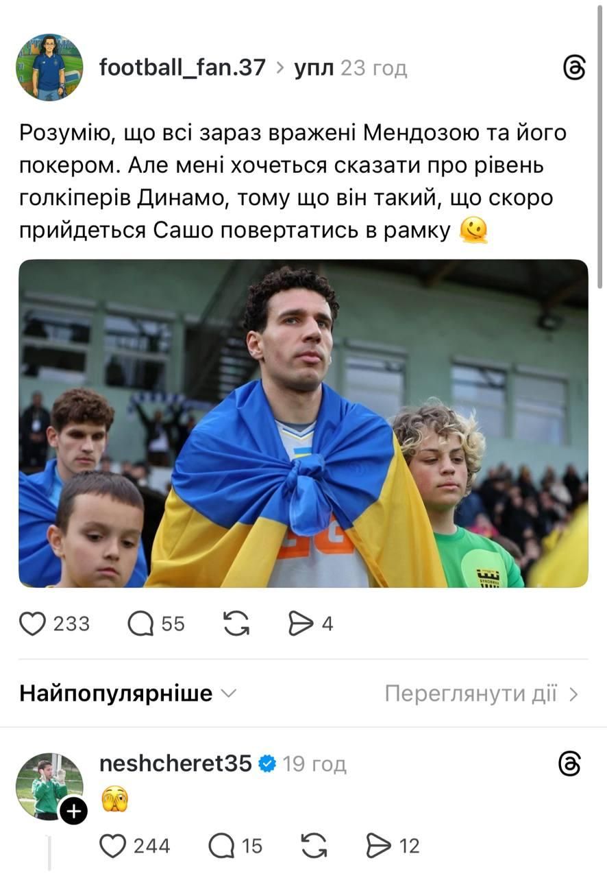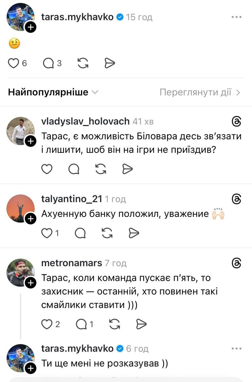 Пользователь этой соцсети после поединка Кривбасс – Динамо в 25-м туре УПЛ поставил под сомнение качество игры кипера киевлян Руслана Нещерета. Он написал, что придется возвращать в ворота Александра Шовковского. Нещерет оставил смайлик в комментариях, но все внимание на себя забрал Михавко.